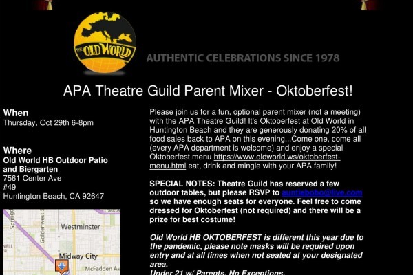 APA PARENTS AND GUARDIANS: join us for a fun, optional mixer hosted by APA Theatre Guild this Thursday (10/29) from 6-8pm at Old World Oktoberfest! Our entire APA community (from every department) is welcome to join in on the fun…as long as you’re over 21!