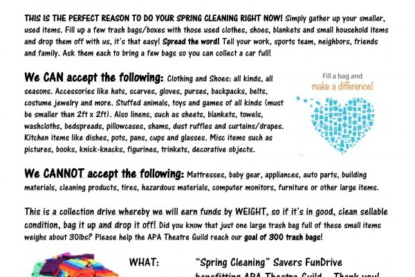 This SUNDAY, April 28, join APA Theatre Guild for our Savers Fundraiser! Donate used clothing, shoes, small household items, or blankets, and our Theatre Guild will earn funds through donated WEIGHT! Bag up your items and drop them off in front of the HBUHSD Auditorium from 10 a.m. to 1 p.m.