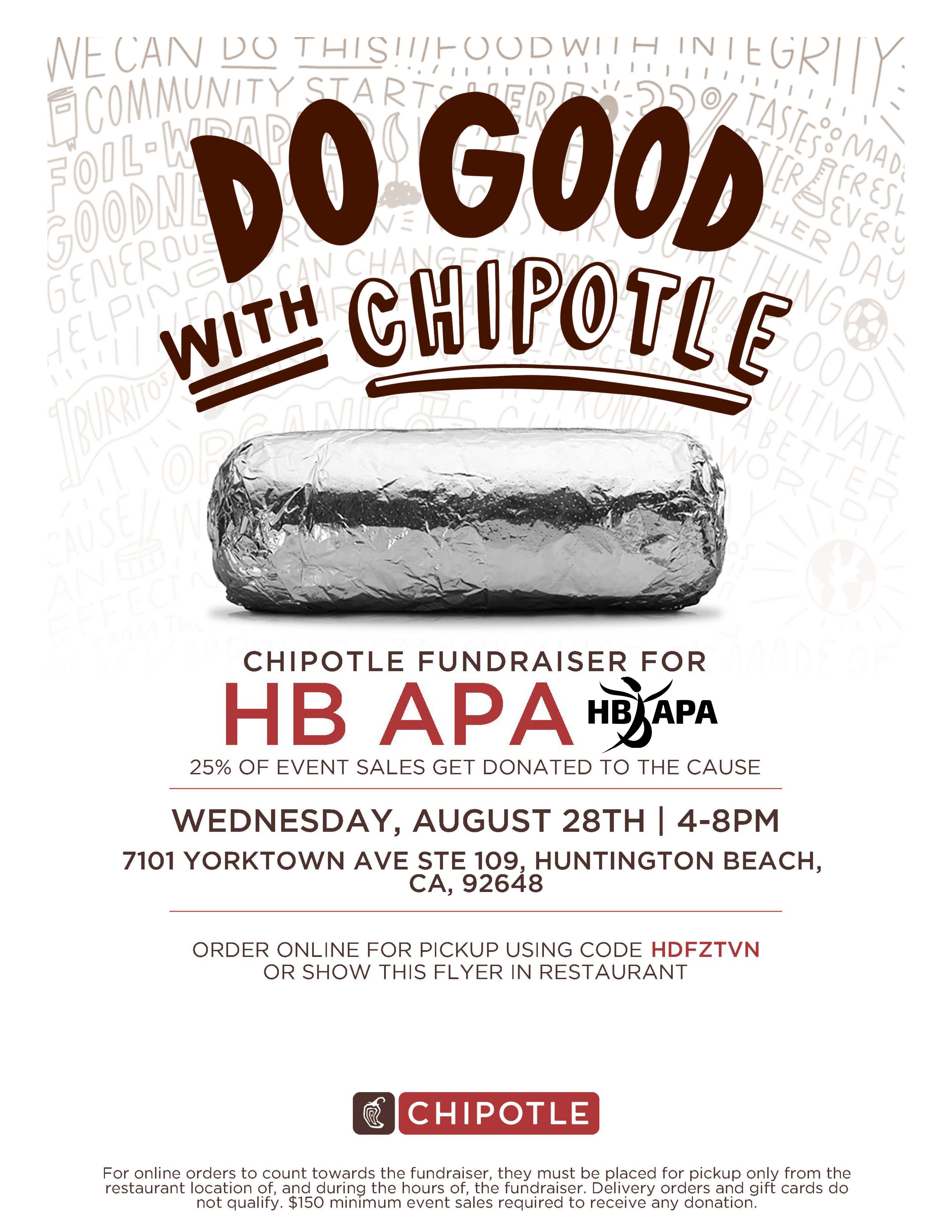 For online orders to count towards the fundraiser, they must be placed for pickup only from the restaurant location of, and during the hours of, the fundraiser. Delivery orders and gift cards do not qualify. $150 minimum event sales required to receive any donation.CHIPOTLE FUNDRAISER FOR HBAPA 25% OF EVENT SALES GET DONATED TO THE CAUSE