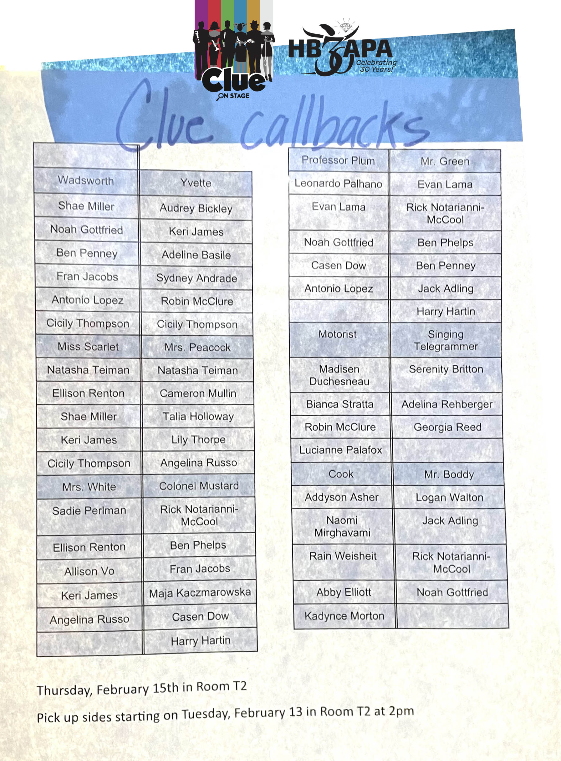 Thank you to all who auditioned for APA Acting’s 2024 production of CLUE! Please click the link for the CLUE CALL BACK LIST with dates/times listed.