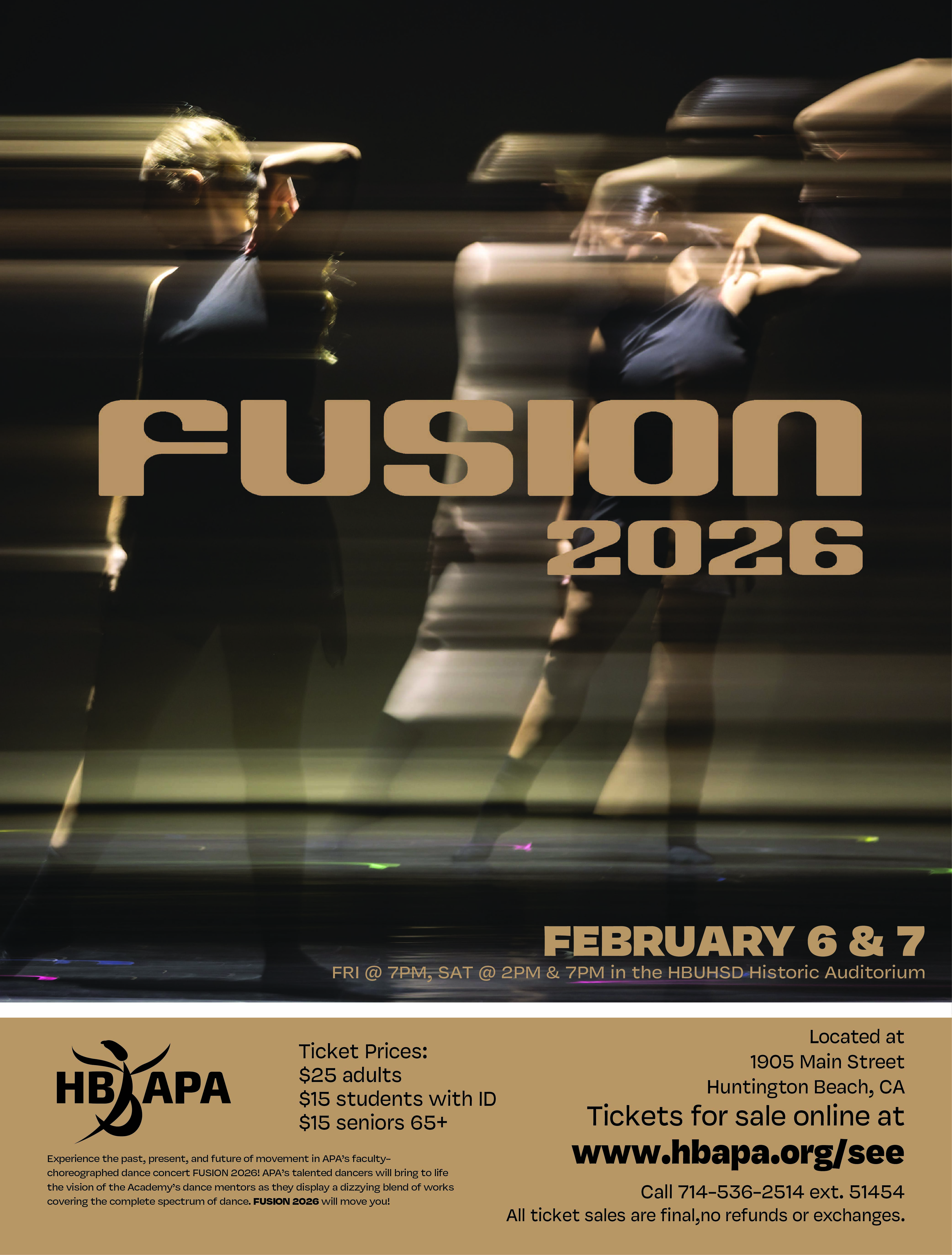Experience the past, present, and future of movement in APA’s faculty-choreographed dance concert FUSION 2026! APA’s talented dancers will bring to life the vision of the Academy’s dance mentors as they display a dizzying blend of works covering the complete spectrum of dance. FUSION 2026 will move you!
