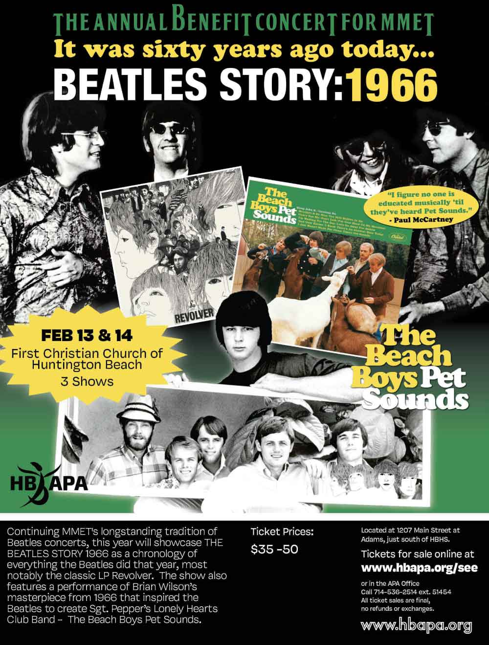 Continuing MMET's longstanding tradition of Beatles concerts, this year will showcase THE BEATLES STORY 1966 as a chronology of everything the Beatles did that year, most notably the classic LP Revolver. The show also features a performance of Brian Wilson’s masterpiece from 1966 that inspired the Beatles to create Sgt. Pepper’s: The Beach Boys Pet Sounds.